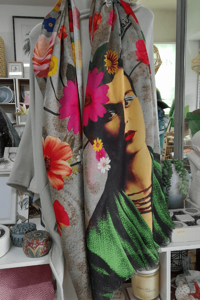 This stunning Frida Artwork Scarf is crafted with fringed edges for a classic finish.