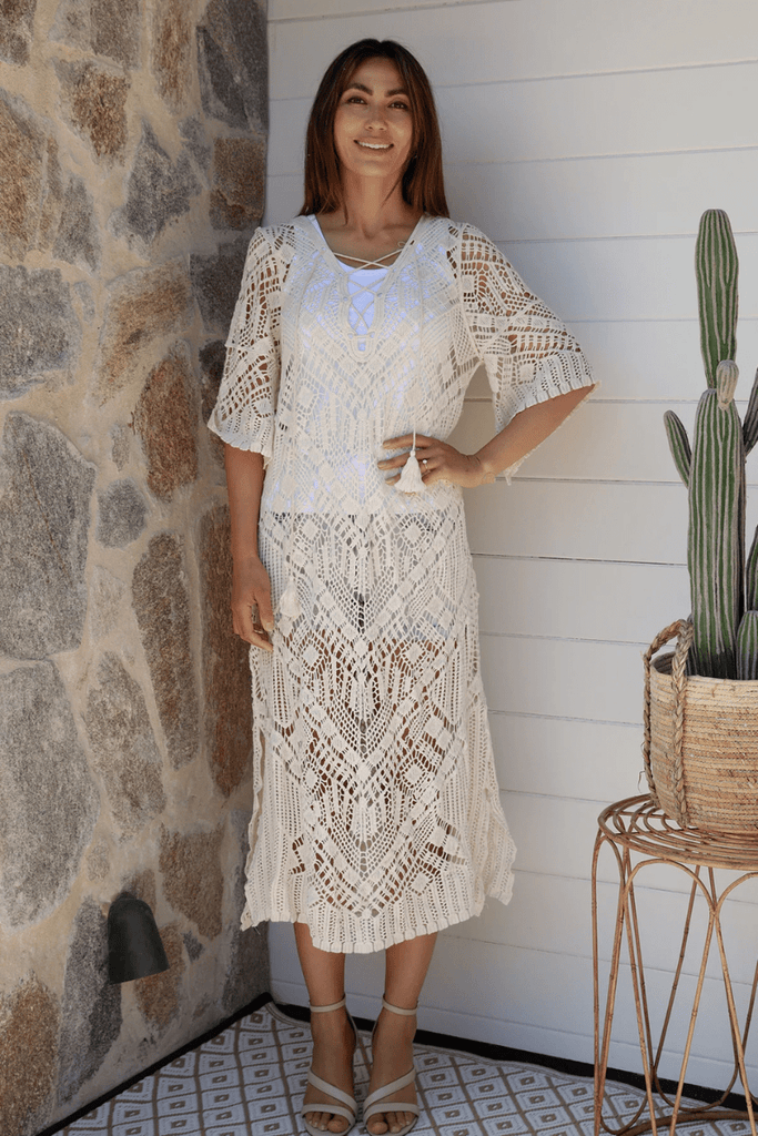 Featuring intricate crochet detailing and a flowy maxi length, this cover up will add a touch of effortless elegance to any beach or pool day.