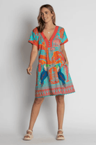 Discover effortless elegance with the Lula Life Marquita Dress in Lagoon. This Australian-designed summer essential combines breathable 100% cotton with thoughtful details that elevate your everyday style. The flattering A-line silhouette, V-neck with contrasting trim, and front-buttoned empire waist create a universally flattering shape, while functional side pockets keep your essentials within reach. A vibrant tropical digital print injects personality and movement into your wardrobe, perfect for everything from weekend brunches to casual adventures. The refined bordered hem adds polish without compromising comfort. Experience the perfect marriage of practicality and style and comfort on those very hot days.