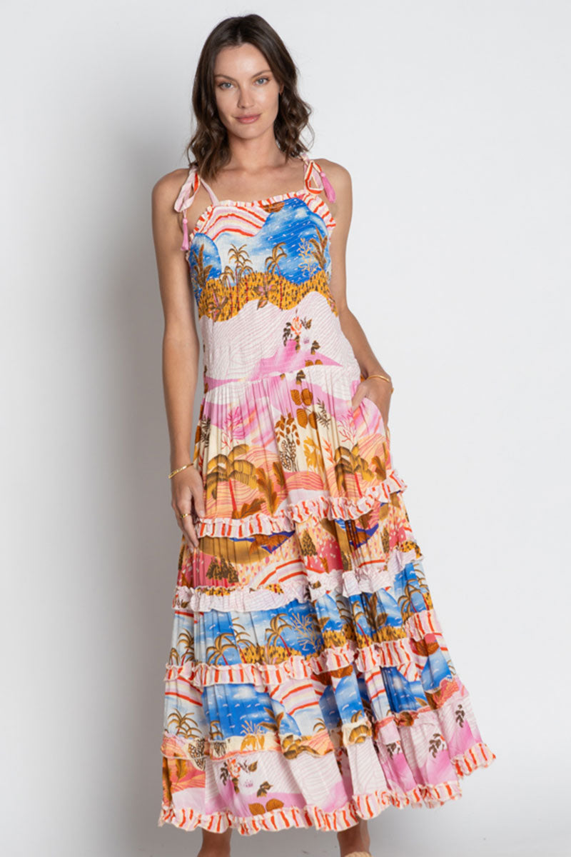The lightweight 100% viscose modal fabric offers a soft, breathable feel with beautiful drape and movement, perfect for warm days and sunset strolls. Featuring adjustable shoulder ties, a tiered skirt with ruffle details, and a relaxed silhouette, it flatters every shape while ensuring all-day comfort. Practical side pockets complete this easy-wear style.