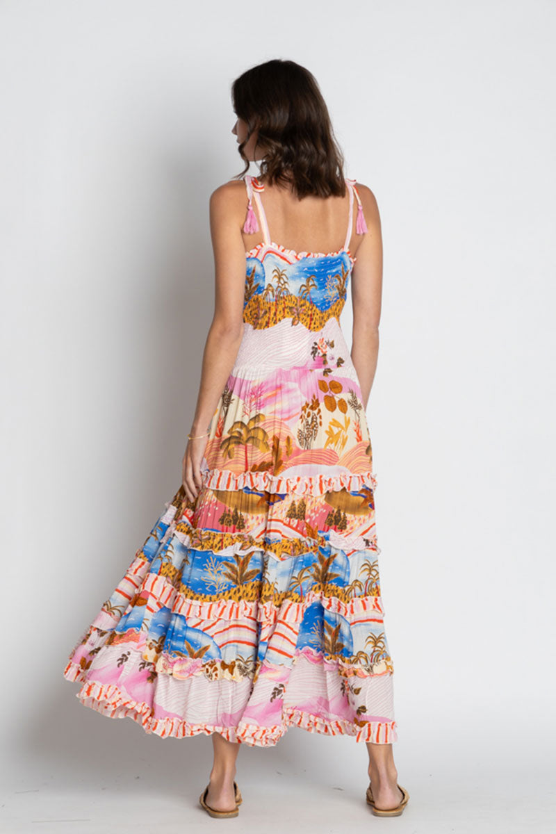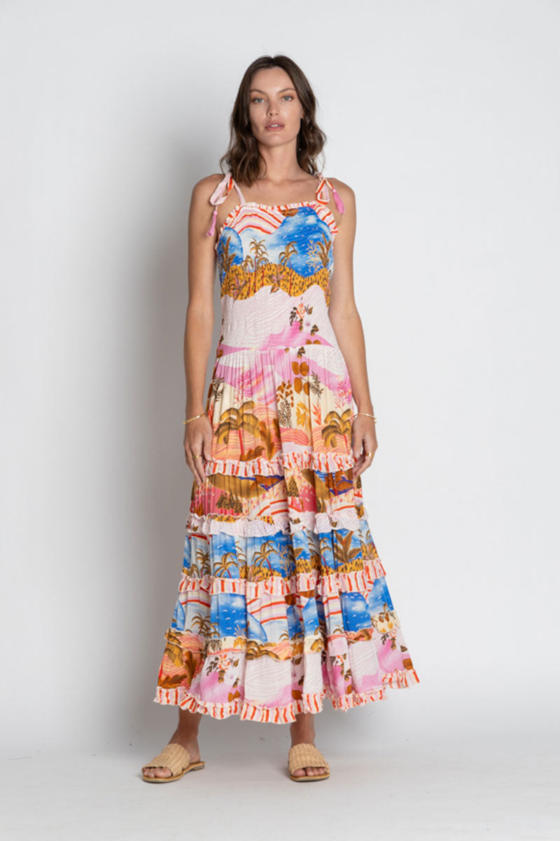 Bring effortless elegance to your summer wardrobe with the LulaSoul Jimbaran Sundress in Musk. Designed in Australia, this statement piece captures a carefree coastal vibe through its vibrant tropical digital print in dreamy tones of pink, blue, and gold.