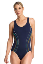 Poolproof Rozella Side Splice Tank One Piece Hidden demi underwire Elastic shelf bra Regular pant cut Mid scoop back Vee neckline Piped panel detail