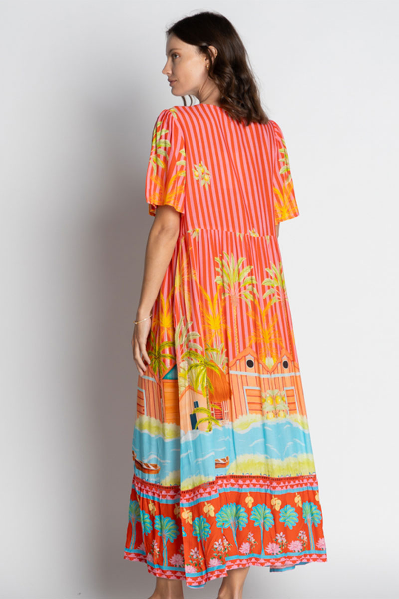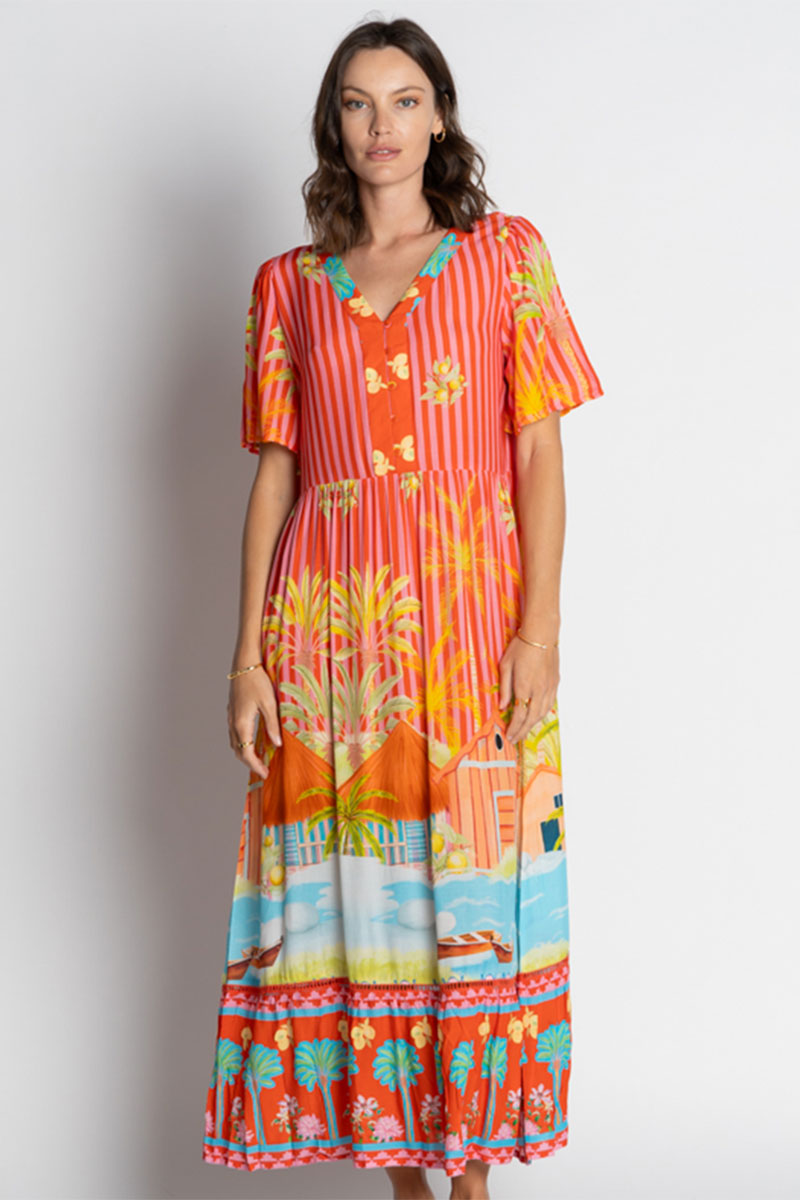Radiate tropical charm in the LulaSoul Mardiva Midi Dress in Melon, a stunning fusion of vibrant color and relaxed sophistication. Designed in Australia, this eye-catching piece showcases a bold tropical digital print featuring vivid hues of coral, turquoise, and sunshine yellow — perfect for brightening any occasion.