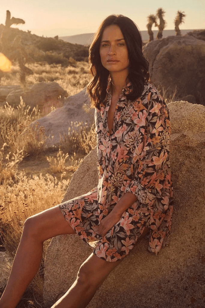 Style to go with our Roma Print Swimwear. This beautiful floral pinks and orange Kaftan has side pockets a collar to protect and sleeves that roll up with button tab detail.