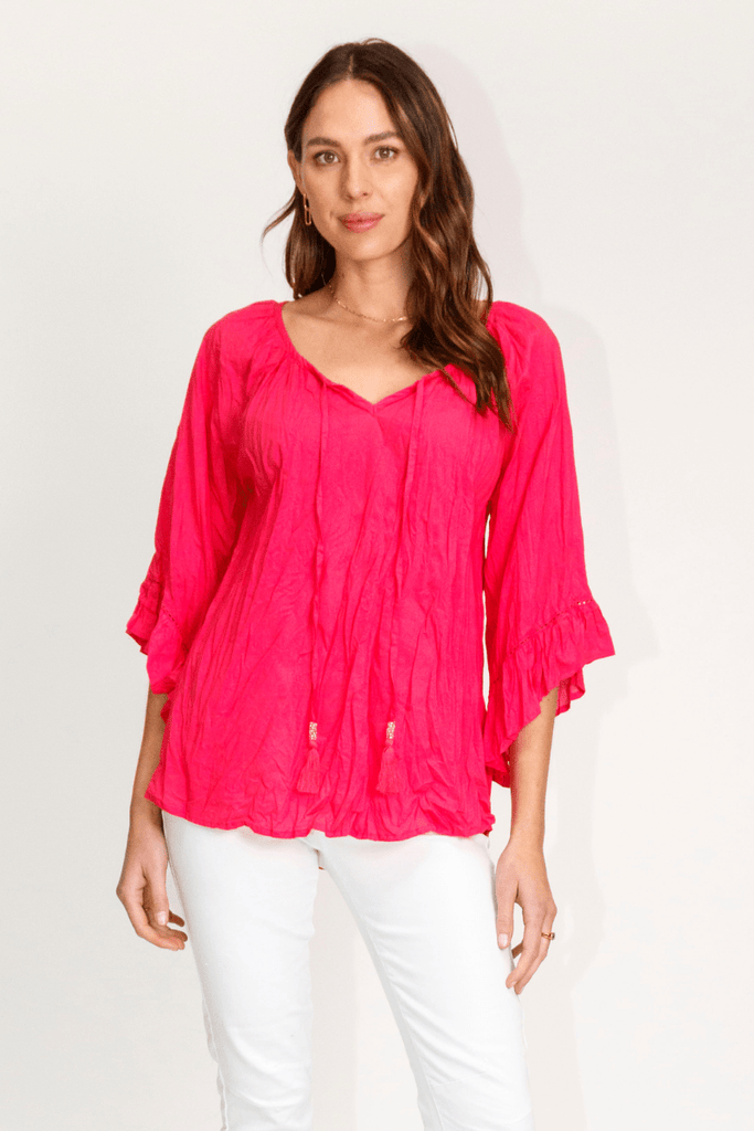 Embrace life in the Lula life Chloe Melon V Neck Top designed in soft cotton voile to give you relaxed comfort. Its timeless design features a 3/4 sleeve, making it both simple and versatile. Enjoy effortless style and sophistication on any occasion.