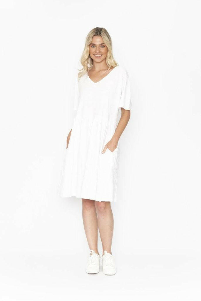 A winner for summer simple in design but great for summer over your cozzie or throw a scarf on and dress it up for lunch. This 'RELAX by ONE SUMMER' LUNA RUCHED DRESS (R21) is a V-neck, Short sleeve  100% cotton Dress with a gathered tiered skirt. just above the knee length and has side pockets.