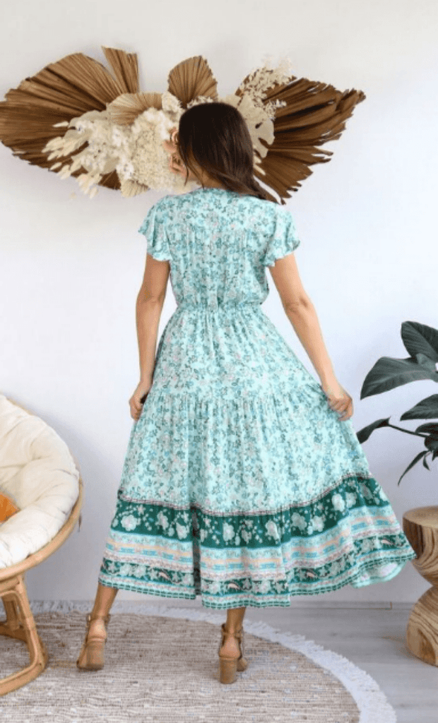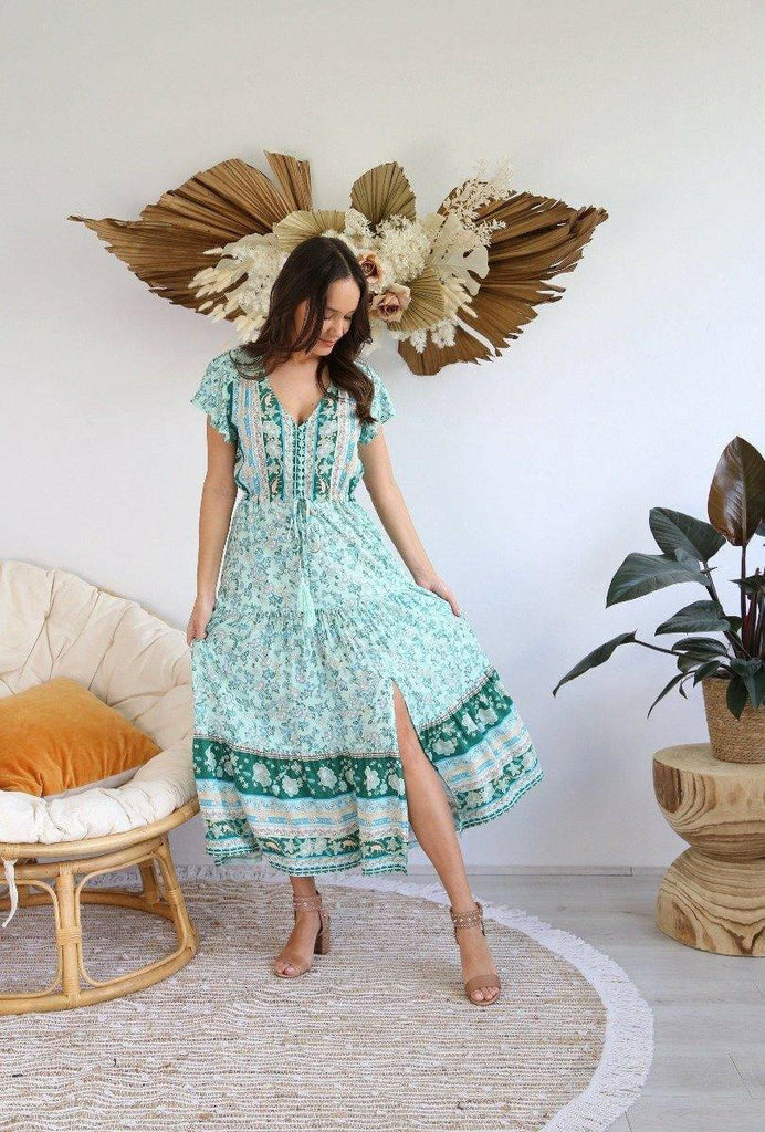 S0425-131 Salty Bright Vibrant Long Mixed Green Dress 100% Rayon