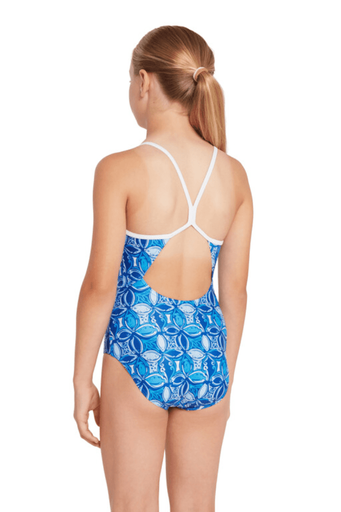 The Zoggs Sprintback One Piece in Blue Fish design is perfect for junior girls. Its eco-friendly Ecolast™ fabrication is made from recycled plastic bottles and offers superior chlorine resistance, sun protection and quick drying. With a front lining, modest thin straps, and 4-way stretch for shape retention, this suit allows maximum freedom of movement.